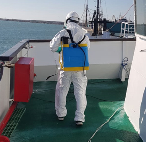 Desinfección preventiva de instalaciones/buques: se realiza la desinfección con personal capacitado portando los Elementos de Protección Personal (EPP) correspondientes. Dicha desinfección se efectúa con mochilas pulverizadoras utilizando productos certificados por ANMAT/SENASA, se desinfectan todos los puntos de contacto para evitar la propagación del virus.