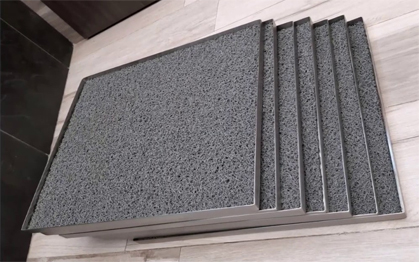 Venta de Bandeja Alfombra Sanitizante: a fin de cumplir con el protocolo de sanitización de calzado. Se trata de una bandeja de chapa galvanizada (40 x 55 x 2 cm), con alfombra de pvc texturizada lavable de alta resistencia, inalterable al agua sol y agentes químicos.